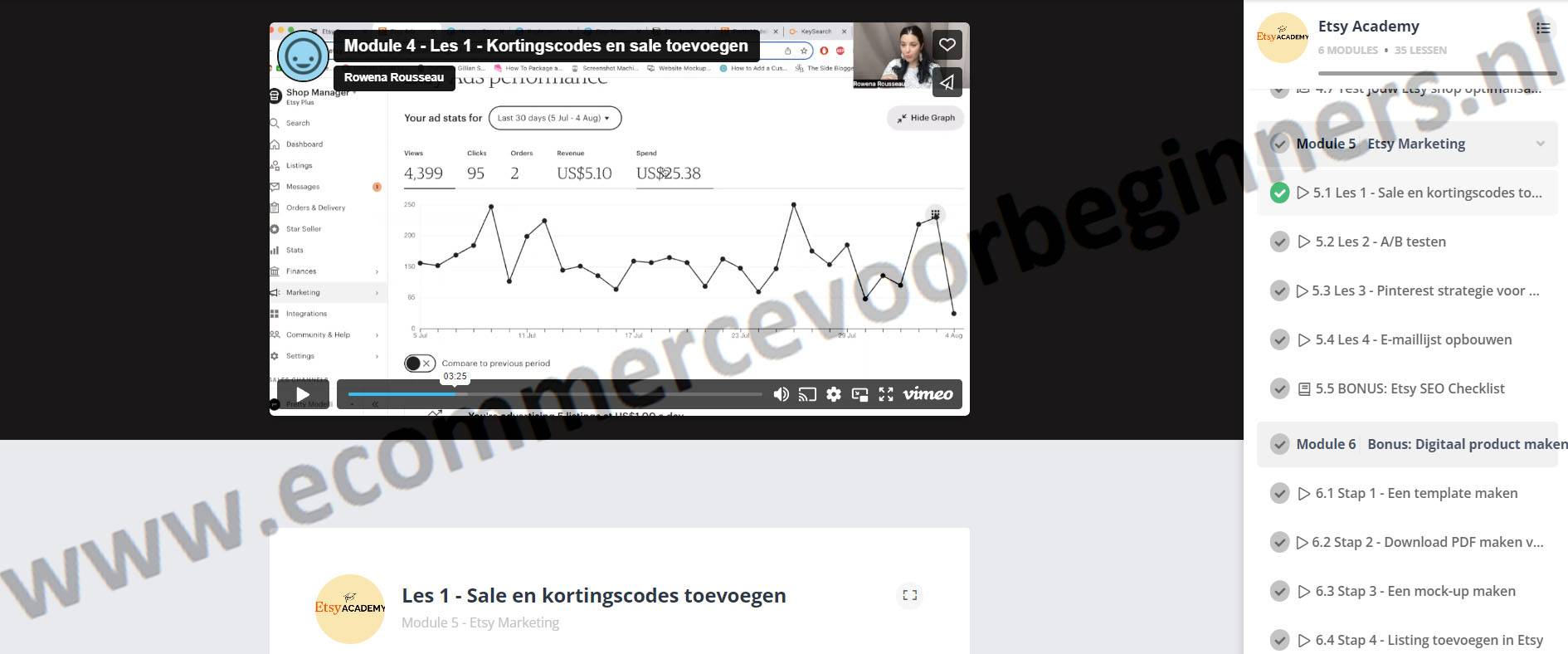 Rowena Rousseau biedt duidelijke modules die je stap voor stap begeleiden bij het opzetten en optimaliseren van je Etsy-winkel. De modules zijn goed gestructureerd en gemakkelijk te volgen.